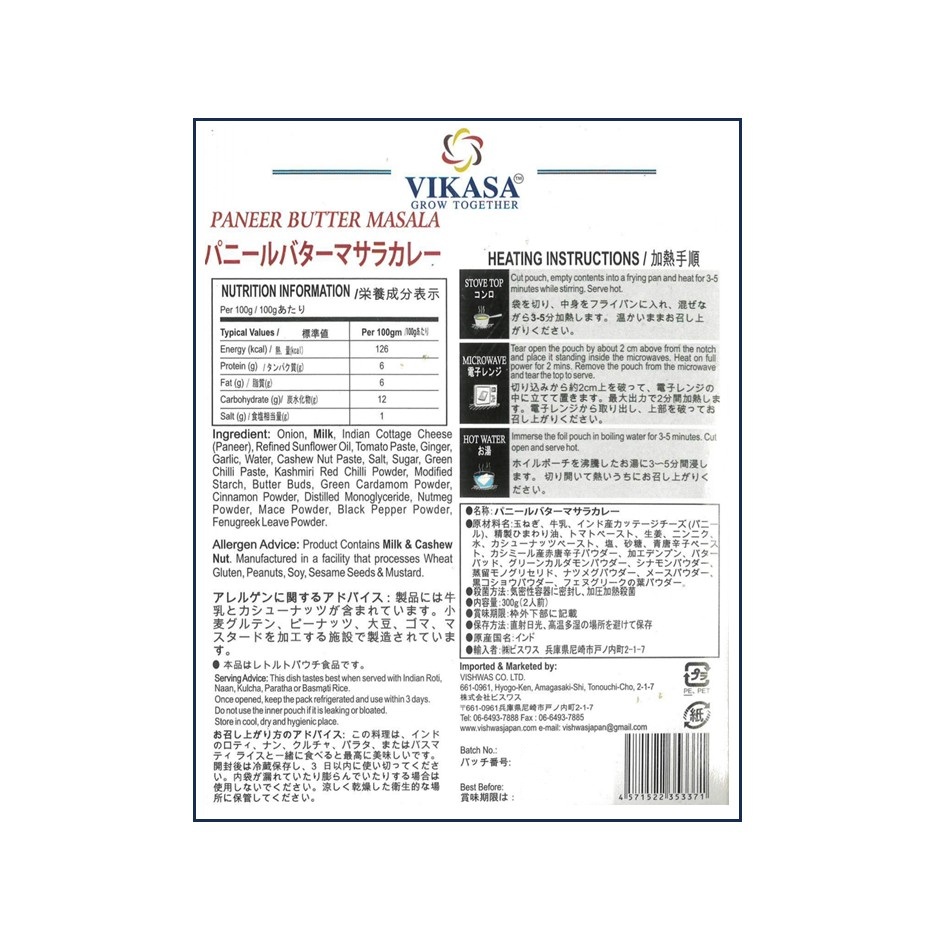 玉ねぎ、牛乳、インド産カッテージチーズ(パニール)、精製ひまわり油、トマトペースト、生姜、にんにく、水、カシューナッツペースト、塩、砂糖、グリーンチリペースト、カシミールレッドチリパウダー、加工デンプン、バター、グリーンカルダモンパウダー、シナモンパウダー、蒸留モノグリセリド、ナツメグパウダー、メースパウダー、ブラックペッパーパウダー、フェヌグリークの葉パウダー