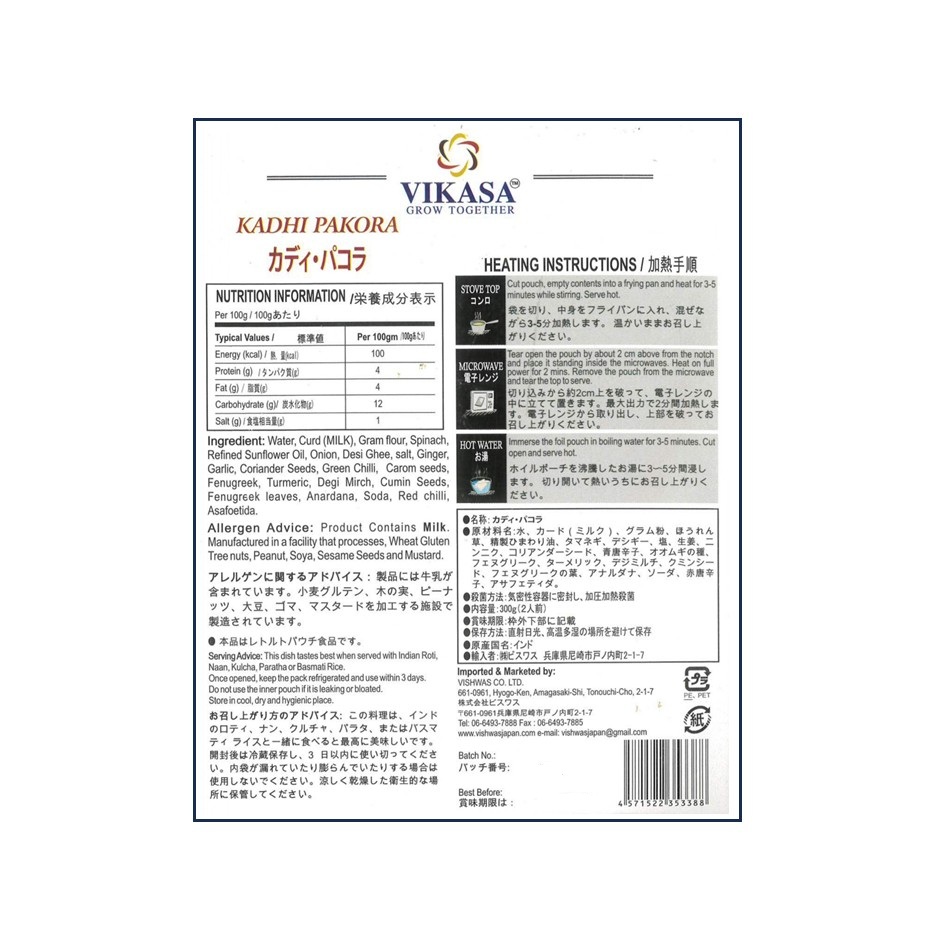 水、カード(MILK)、グラム粉、ほうれん草、精製ひまわり油、玉ねぎ、デシギー、塩、生姜、にんにく、コリアンダーシード、青唐辛子、オオムギの種、フェヌグリーク、ターメリック、デギミルチ、クミンシード、フェヌグリークの葉、アナルダナ、ソーダ、赤唐辛子、アサフェティダ