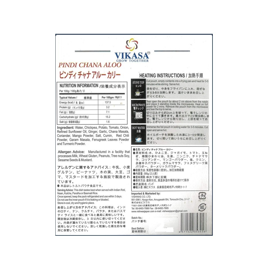 水、ひよこ豆、じゃがいも、トマト、玉ねぎ、精製ひまわり油、しょうが、にんにく、チャナマサラ、コリアンダー、マンゴーパウダー、食塩、クミン、レッドチリパウダー、ガラムマサラ、フェヌグリークリーフパウダー、ターメリックパウダー
