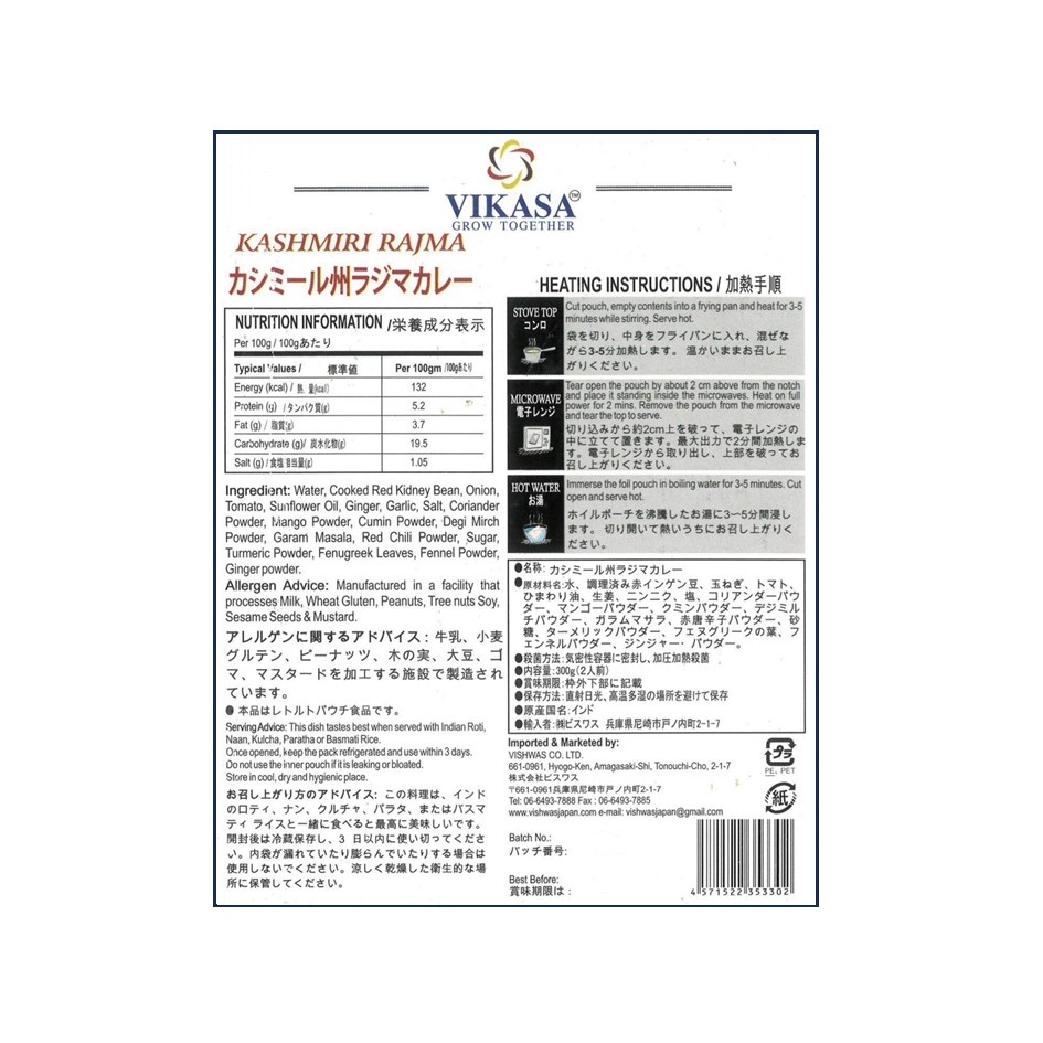水、調理済み赤インゲン豆、玉ねぎ、トマト、ひまわり油、生姜、にんにく、塩、コリアンダーパウダー、マンゴーパウダー、クミンパウダー、デギミルチパウダー、ガラムマサラ、赤唐辛子パウダー、砂糖、ターメリックパウダー、フェヌグリークの葉、フェンネルパウダー、ジンジャーパウダー