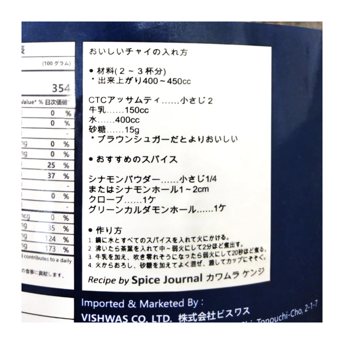 スパイス(カルダモン、シナモン、クローブ、生姜など)と一緒に煮出すことで、本格的なインドチャイをお楽しみいただけます。