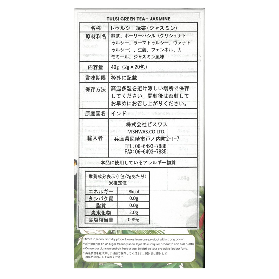 緑茶、ホーリーバジル(クリシュナトゥルシー、ラーマトゥルシー、ヴァナトゥルシー)、生姜、フェンネル、カモミール、ジャスミン風味